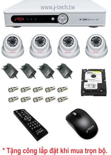- Trọn bộ bao gồm : 1 đầu ghi J-TECH JT-04D + 1 ổ cứng Seagate 250Gb + 4 camera J-TECH D236i + 4 Adaptor + 10 đầu nối + remote điều khiển + chuột điều khiển.