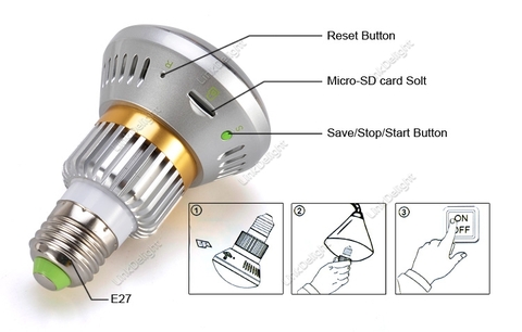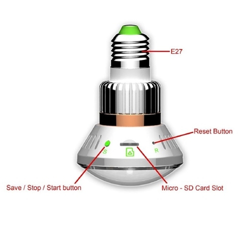 Camera IP đèn LED - Camera IP kết hợp đầu ghi hình dạng bóng đèn LED - Ngụy trang siêu nét chuẩn full hd thế hệ mới siêu bí mật. - Bạn là chủ cửa hàng, shop thời trang, bạn là chủ nhà,,....Bạn muốn quan sát nhân viên, osin, người làm một cách bí mật thì đây là sản phẩm phù hợp với nhu cầu của bạn. Xem online sản phẩm: - Vào trang bulbcam.net / CHPlay / Appstore down ứng dụng về thiết bị. - User: LH01322B / Pass: 123456 Thông số kỹ thuật: '- Simple installation,...