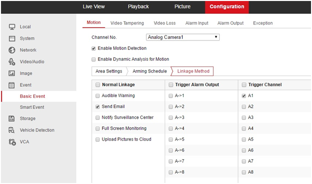 Bước 3 : Vào event (sự kiện) , bật chức năng chuyển động (motion detection) , check vào mục send mail, chọn camera cần báo động.