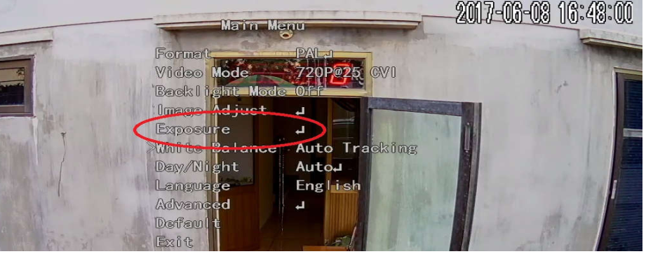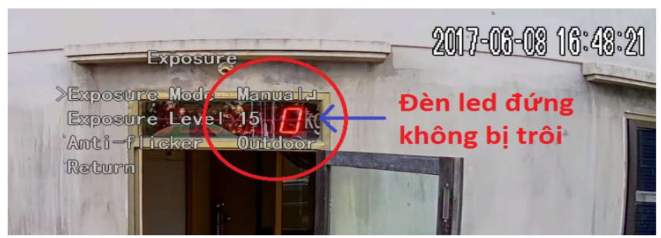 - Trong Menu Exposure thay đổi giá trị "Exposure Level" và thay đổi giá trị "Anti flicker"làm sao cho tương ứng để nhìn thấy số và chữ trên bảng Led.
