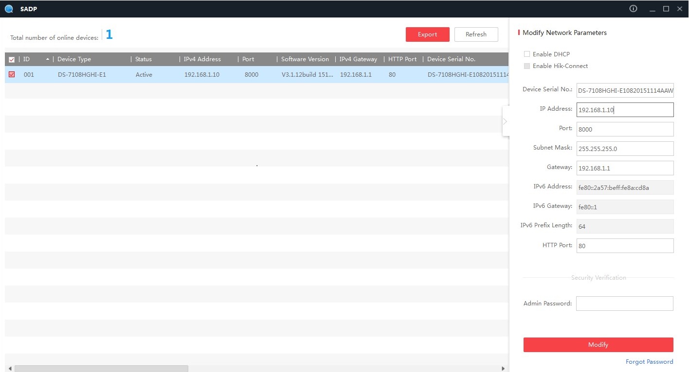 – Tiếp đến chúng ta chọn 1 Device cần thay đổi kích vào đó, Bên tay phải chúng ta chỉ việc chỉnh lại địa chỉ IP và Gateway mặc định cần đổi, nhập mật khẩu thiết bị nhấn Modify là đổi thành công.