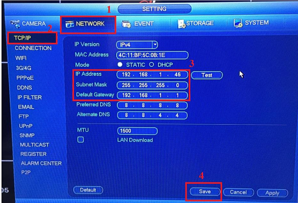 - Bước 2 : Đổi địa chỉ IP trên đầu ghi về cùng dải mạng với dải mạng của nhà khách :