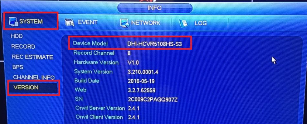 - Bước 3 : Xác định Model – Version của đầu ghi để tải về phần mềm mới phù hợp Main Menu -> System (Mục Info) -> Version