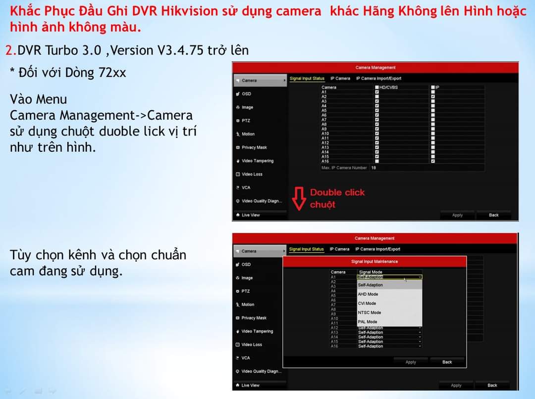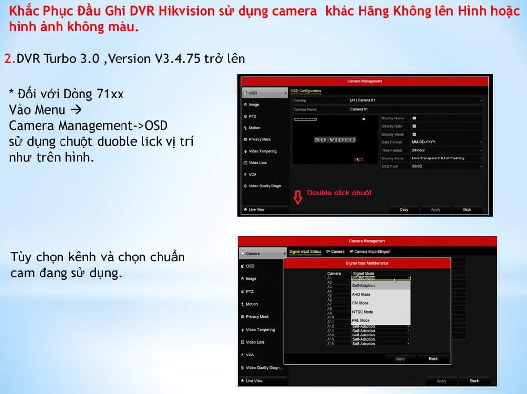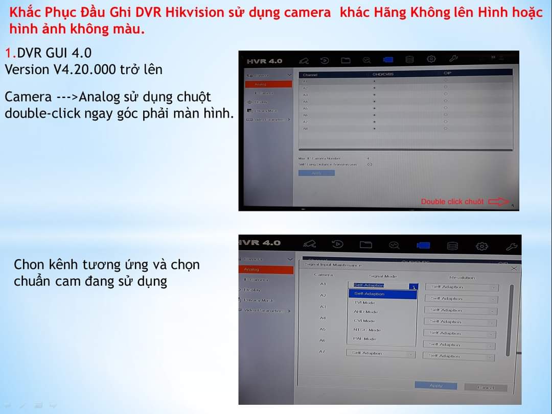 Gia Nguyễn xin hướng dẫn cách khắc phục tình trạng camera khác chuẩn TVI gắn vào đầu ghi hình của Hikvision & Hdparagon bị mất màu ( đen trắng ) như sau: