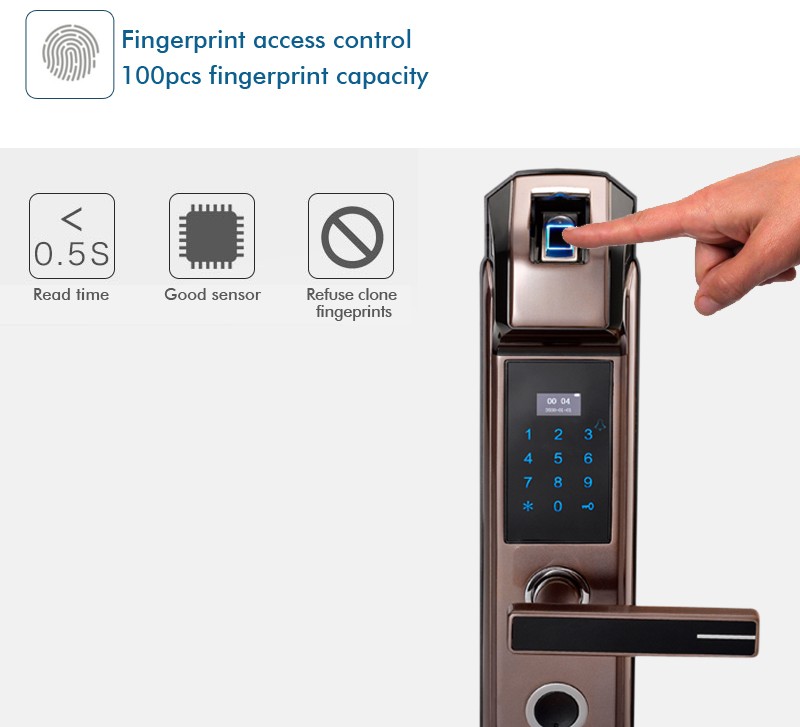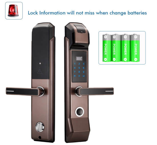 Mở bằng Vân tay (100 vân tay) Mở bằng Thẻ IC card (100 thẻ card) Mở bằng mật mã 6 ký tự (100 user) Mở bẳng Chìa cơ dự phòng trường hợp hết pin. Thiết kế kim loại sang trọng, màu nâu bóng Pin dùng mở khóa khoảng 5000-6000 lần Kích thước: 335*71*80mm Dùng cho cửa phòng nhà phố, biệt thự, phòng riêng văn phòng.v..v