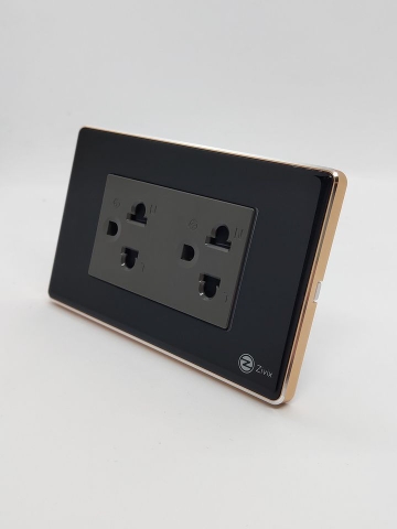 Màu sắc: đen, viền nhôm Hình dáng: vuông/ hình chữ nhật Chủng loại: 2 ổ ba chấu, ổ âm tường Điện áp: 250 VAC - 16A Ổ cắm cơ đồng bộ mặt kính Bảo hành: 12 tháng