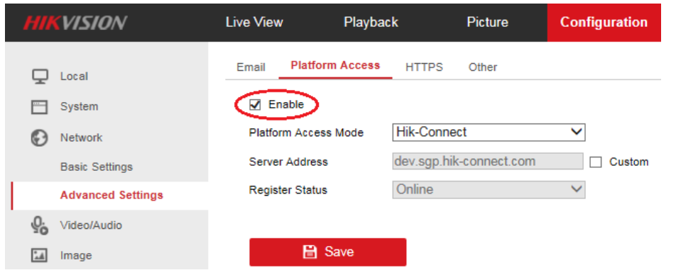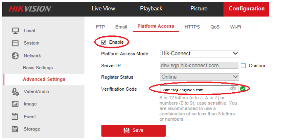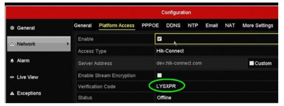 Chú ý: Giao diện thiết bị cũ sẽ không hiển thị mã “Verification Code” chúng ta phải vào trực tiếp màn hình của đầu ghi hình (Menu - Configuration ->Network -> Advanced Settings) hoặc xem trên tem của sản phẩm. Bắt buộc phải có mã “Verification Code” mới sử dụng được hik-connect.