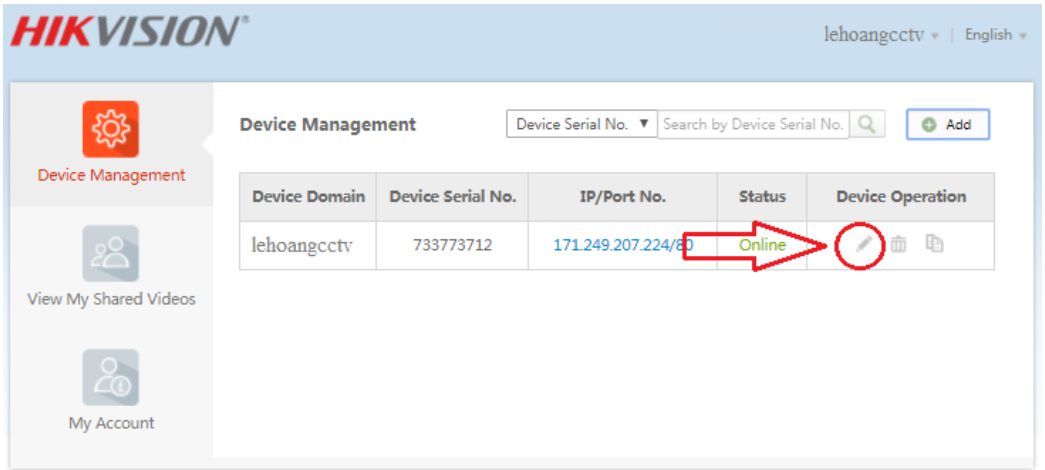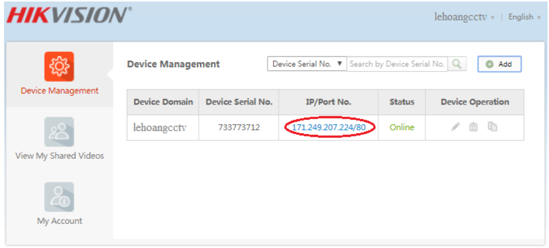 Bước 1: Truy cập www.hik-connect.com login vào tài khoản Hik-Connect của bạn. Bấm vào địa chỉ IP hiển thị tại mục IP/Port No. trình duyệt sẽ mở liên kết mới tới thiết bị.