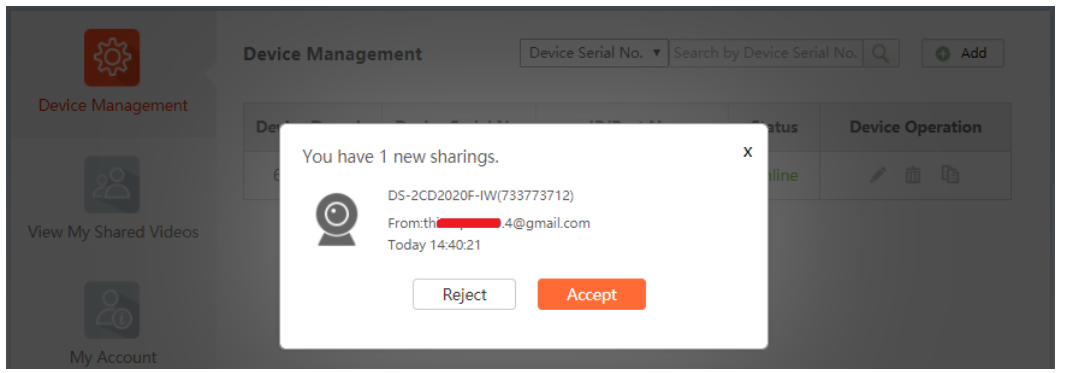 Bước 4: Đăng nhập tài khoản Hik-Connect được share để nhận thiết bị share. Chọn “Accept” để chấp nhận hoặc chọn “Reject” để hủy bỏ.