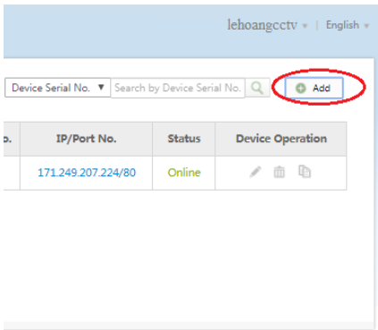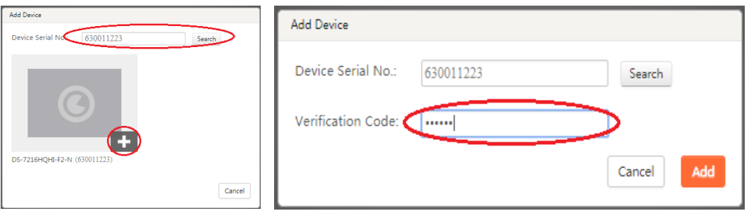 Bước 2: Nhập số serial thiết bị -> bấm “Search” -> bấm “+” -> nhập mã Verification Code - > “Add”