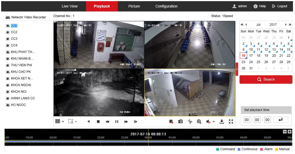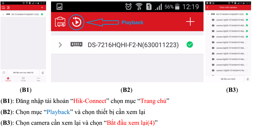 Các bước xem lại qua trình duyệt thông qua tài khoản Hik-Connect tương tự các bước khi xem trực tiếp ở bước (B3) mục 4.1 chọn “Playback”