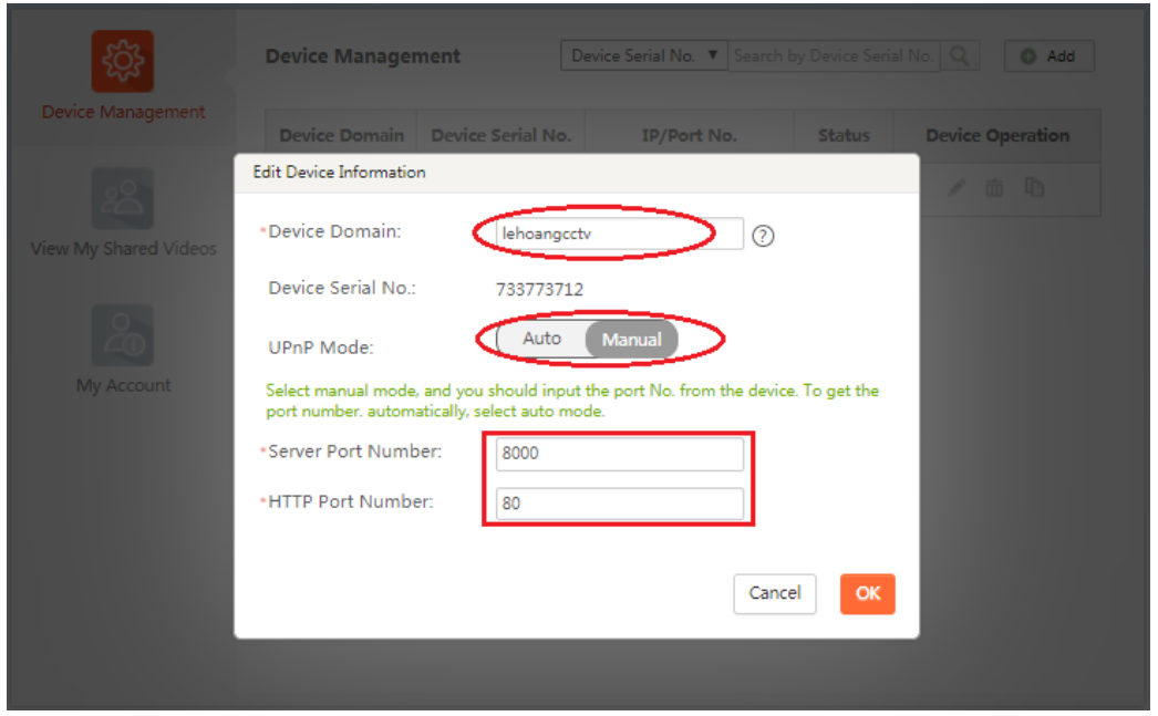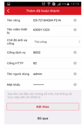 Chú ý: “UPNP Mode” chuyển sang chế độ “Manual” và cập nhật lại “Server Port Number” (8000), “HTTP Port Number” (80) cho đúng theo port khai báo trên thiết bị nếu chế độ “Auto” nhận sai port.